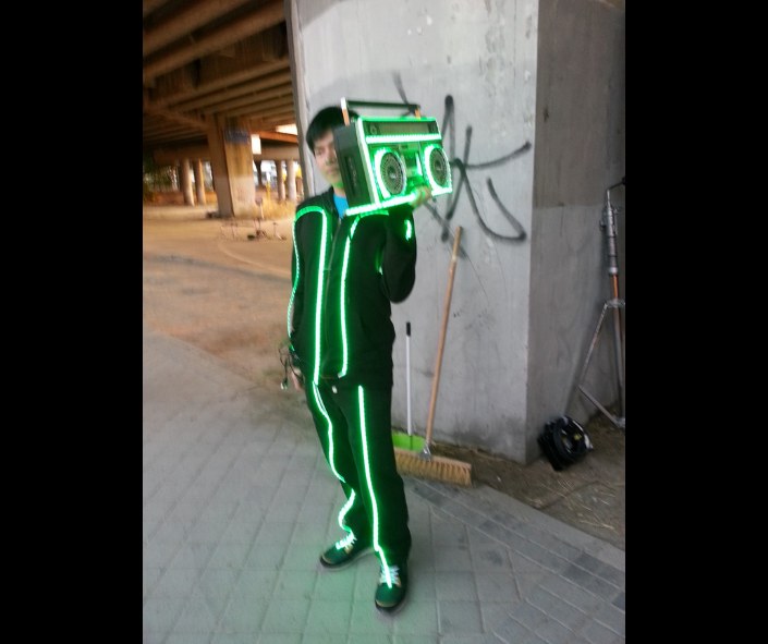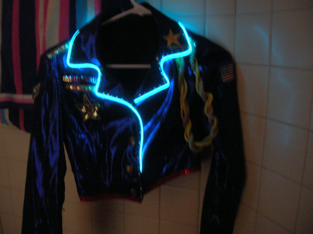 También podemos crear ropa y disfraces con Tiras LED. Es la opción más brillante, aunque require soldaduras, es mas frágil, y requiere el uso de Baterías de Litio.
